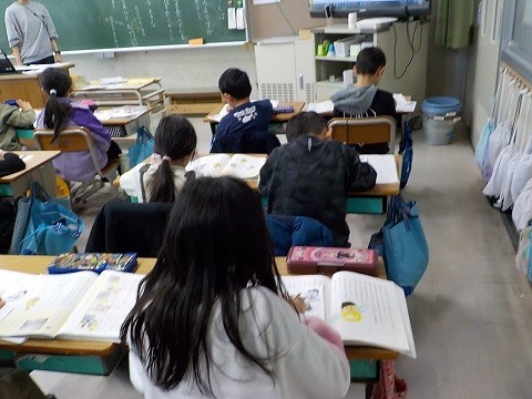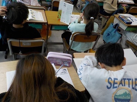 「様子を表す言葉」の学習です。教科書の絵を見て、絵に表されている様子がわかる文章を書いていました。