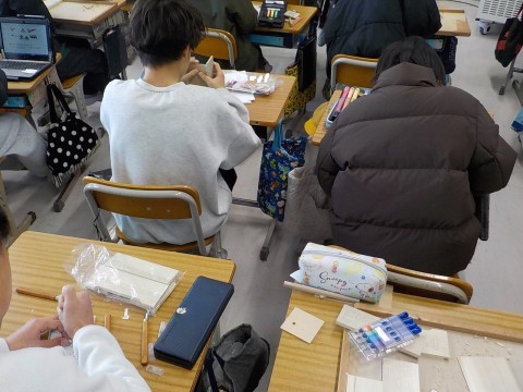 図工では、彫刻刀を使って、作品を作っていました。思い思いの字や絵などを表現しています。