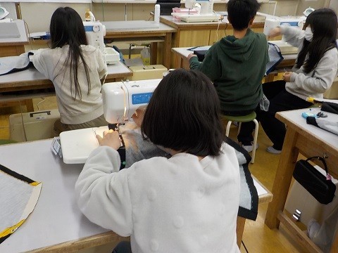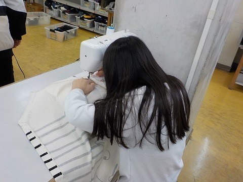 エプロンを作成しています。ミシンでの作業を進めていました。