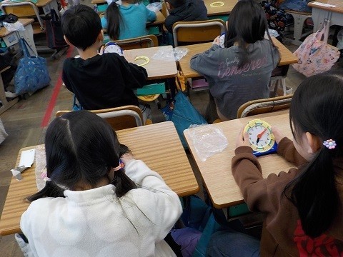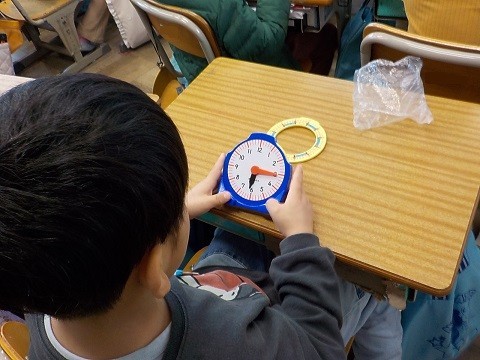 時計の学習です。学習用の時計を使い、時刻の表し方を考えました。