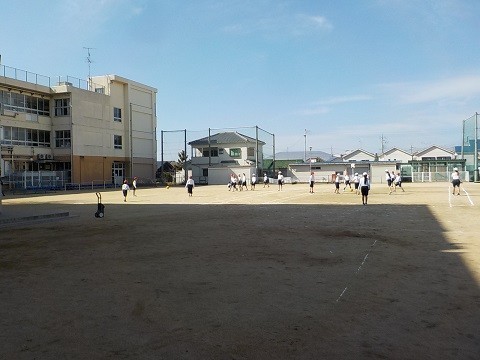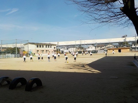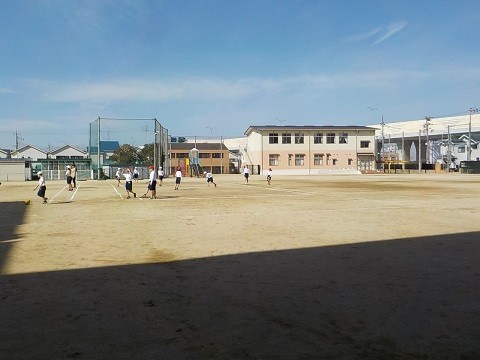 運動場での、サッカーです。チームで作戦を考え、試合を行っていました。