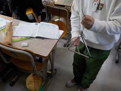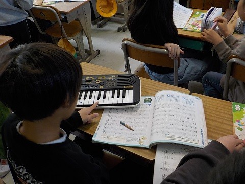 リコーダーや電子鍵盤、トライアングルなどを使って、エーデルワイスの合奏を行います。いろいろな楽器を使い、練習していました。