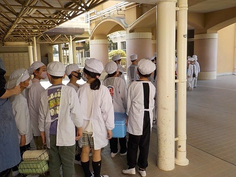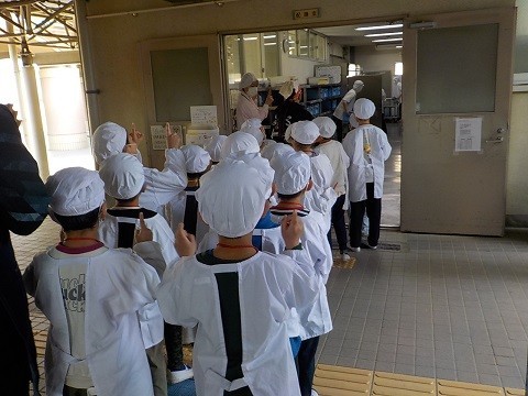 今日で令和7年度の給食が終わります。今の学年での最後の給食になります。「いただきます!」という声とともに、給食当番が給食場に入っていました。