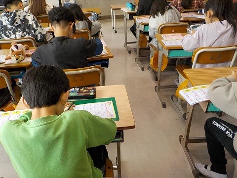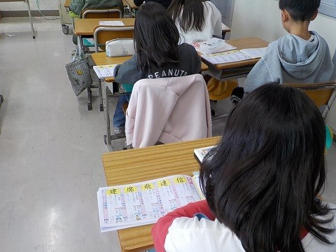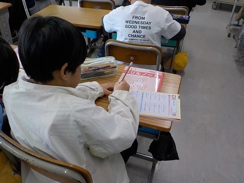 漢字の学習がはじまりました。説明を聞いた後、ていねいに練習していました。