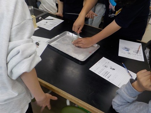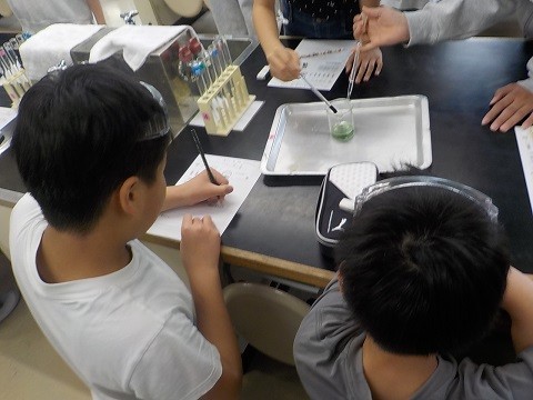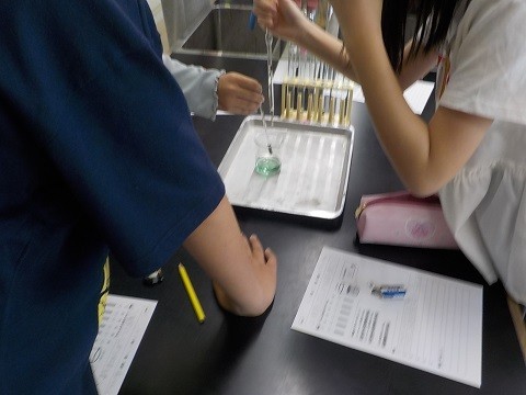 理科の授業がはじまりました。なにをまぜたら、どのような色になるのかを確かめていました。