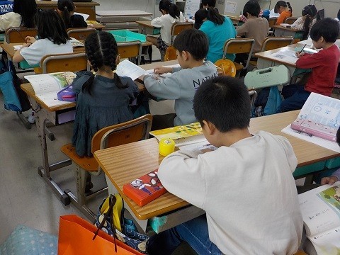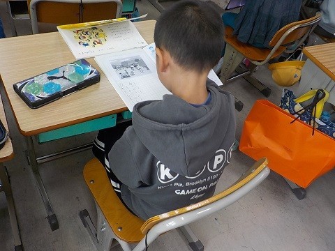 「絵を見て書こう」の学習です。教科書の絵を見て、どこで、どんな人が、どんなことをしているのかをノートに書いていました。