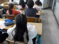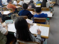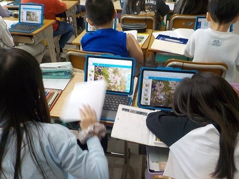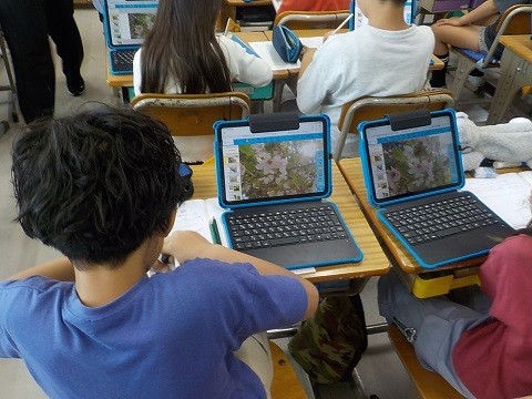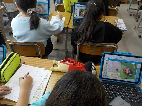 理科です。iPadで、春の草花について調べていました。気が付いたことを、ワークシートにまとめています。