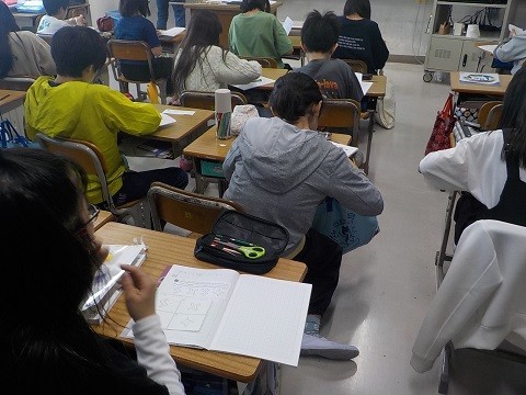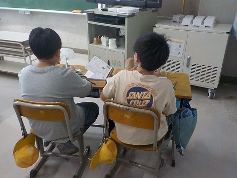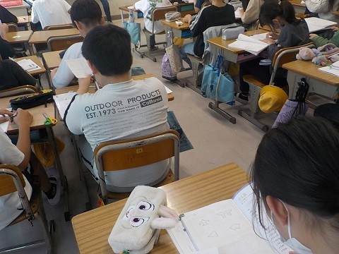 対称な図形の学習です。図形の特徴を考え、仲間分けを行っていました。