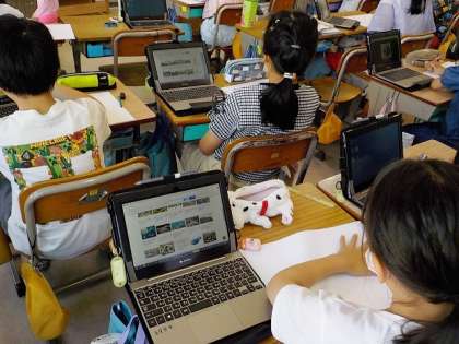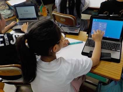 ゴミの問題について、タブレットを使って調べていました。調べたことを、ワークシートにまとめています。