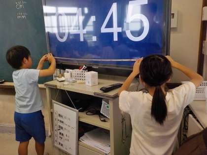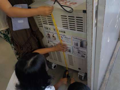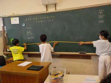長さの学習です。調べたいものの長さを予想し、実際に測っていました。テレビや黒板、先生の身長等の長さを測っていました。