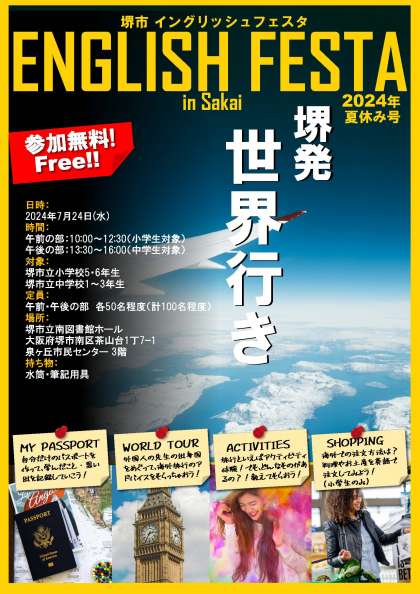 堺市教育委員会より、<堺市 イングリッシュフェスタについて>のお知らせが届きました。詳しくは、下記のパンフレットでご確認ください。