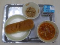 おさつパンミネストローネとりにくのバーベキューソース牛乳