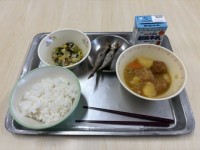 ごはんカレモアプアアのポリネシアンソース牛乳今日は万博献立で、サモアの料理でした...