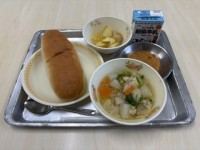 コッペパン冬野菜スープコロッケとろりフルーツのコンポート牛乳