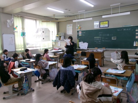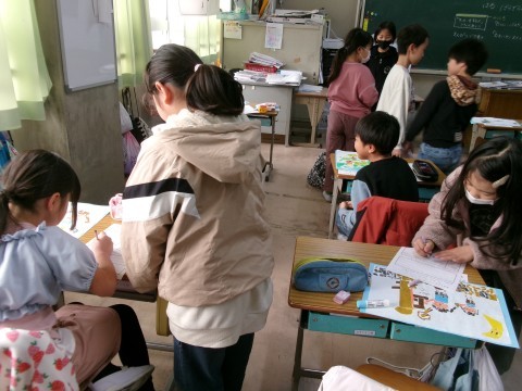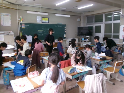 完成した紙版画を鑑賞していました。友達のいいと所を発見して用紙に書いていました。