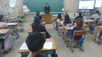 2組は、理科の学習で、ひまわりの花の観察をしていました。根・茎・葉という理科の学習用語を習ったので、それを使いながら、「茎って、太いなあ」などと言いながら見ていました。