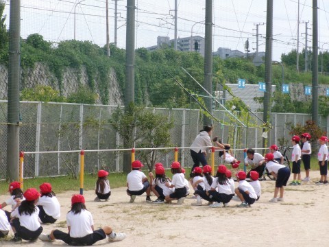 鉄棒にチャレンジです!怖がりすぎないことがまず第1ですが、子ども達に感想を聞くと、「大丈夫やった」「うまくまわれた」「はじめ怖かったけどあとはいけた」などたくをさん自信をつけた声が返ってきました。まずは鉄棒って楽しいなと思ってほしいですね。