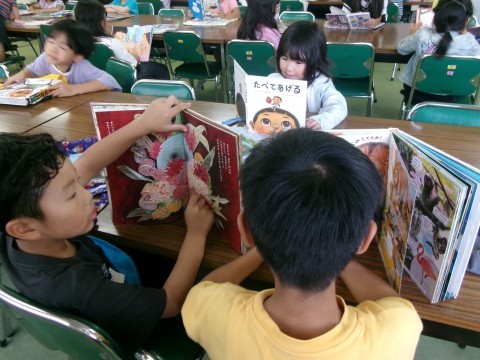 本を集中して読む姿、楽しそうに選ぶ姿、お友達と本について話しながら読む姿、どれもいいですね~。本好きが増えますように!!