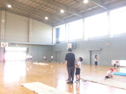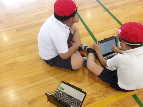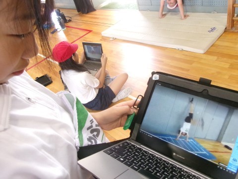 壁倒立にチャレンジしていました。自分たちで動画を撮影し合って,できばえを確認していました。