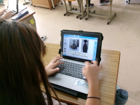 外国の民族衣装や民芸品に実際に触れて、気になったものを写真にとり、不思議に思ったことや気づいたことを書きとめていました。