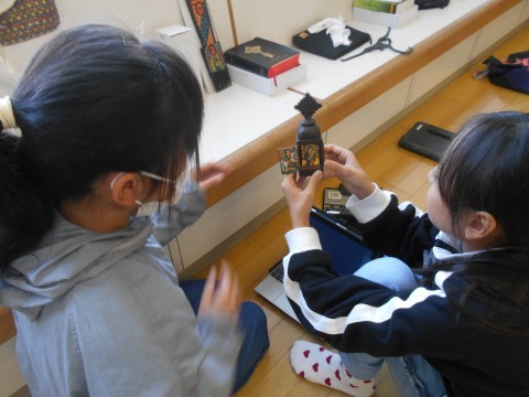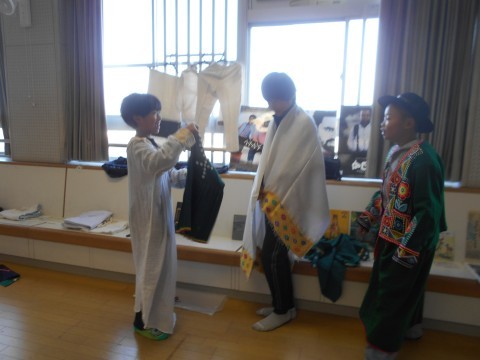 「異文化を知ろう」の取り組みで,今回はエチオピアやアンデス地方の衣装や書籍などを見せてもらいました。