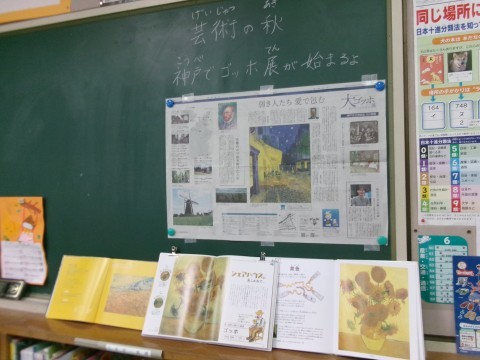今日は、1・2組合同の図書の時間です。楽しそうに本を選んでいる姿があちこちで見られました。後ろに芸術の秋のコーナーがありました。ゴッホの「ひまわり」の絵についての話です。