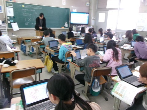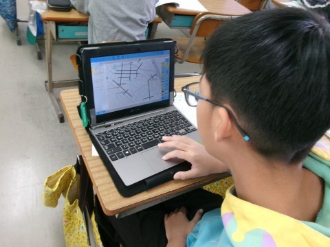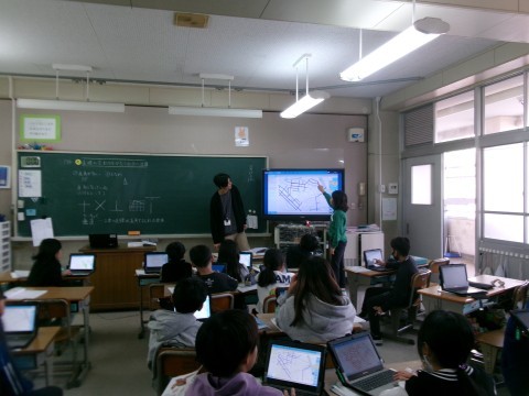 「垂直」とは何かということを学んだあとに、深阪校区の地図を使って、「垂直」となっている道を見つけていました。ICT(パソコン)をうまく活用していて、「ここにもあった~。」などと言いながら子ども達はとても楽しそうに学習していました。