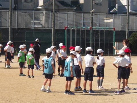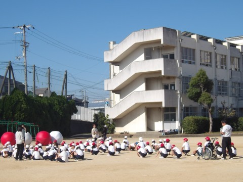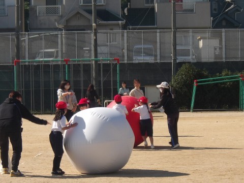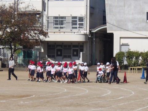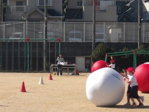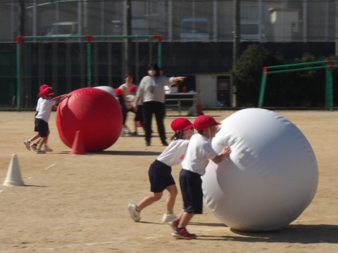 1・2年生は、今日は団体競技の練習です。力を合わせて大玉を運ぶ「大玉送り」です。自分たちの背ぐらいある大きな玉を扱うのは難しいけれど、楽しそうでした。入場行進もばっちり!