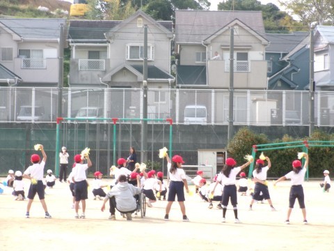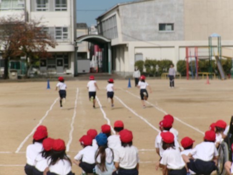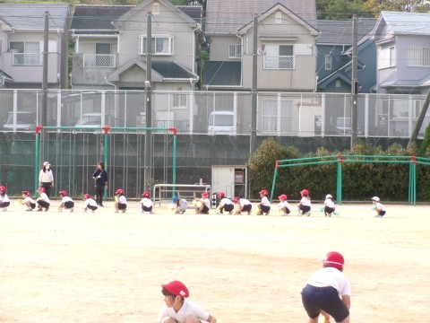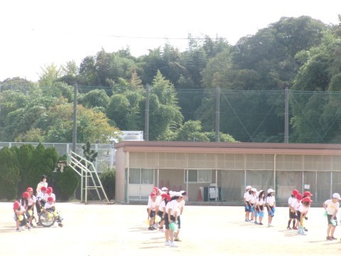 徒競走の練習をしました。まっすぐ走るのって、意外に難しいのですよね~頑張って!後半はダンスの練習です。カラフルな色の腕飾りをつけて、運動場を広く使って楽しく踊っていました。
