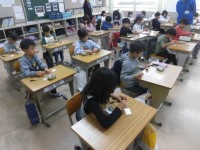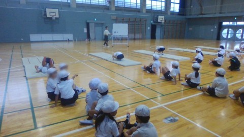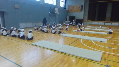 マット運動に挑戦中。前回りは上手にできるようになってきたかな?体をだんごむしのようにまあるくして,おへそを見て回ってみてね!