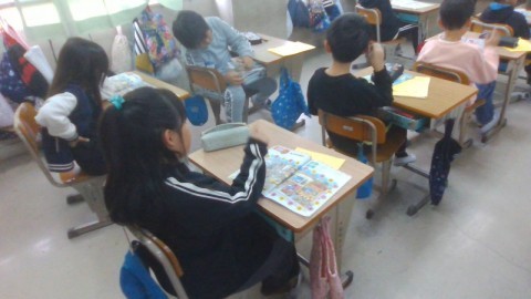教科書に書かれたアルファベットを指さしながら歌う子もいました。