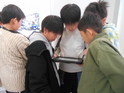 タブレットを使ってグループで相談しながら活動しています。
