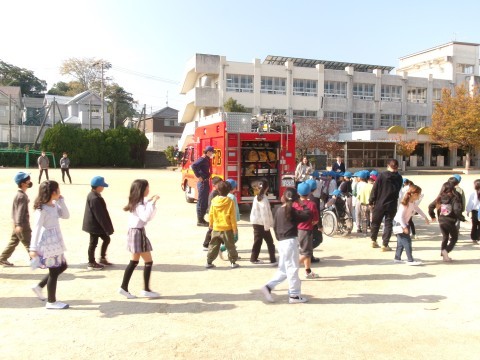今回は遊放時(20分休憩)に、理科室から出火したという想定で避難訓練を実施しました。水消火器体験を教師も児童も行いました。消防署の人や校長先生のお話を聞いて、最後に消防車を見学させていただきました。