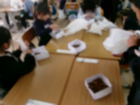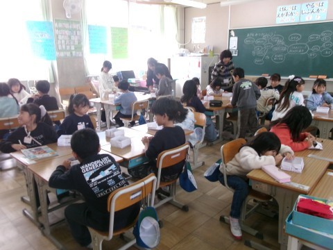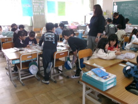 「秋見つけ」で、先日地域の公園で拾ってきたどんぐりや落ち葉を嬉しそうに見ています。教科書と見比べて、何かな?と調べている場面も。とても生き生き楽しそうでした。