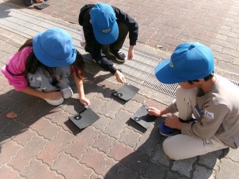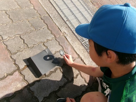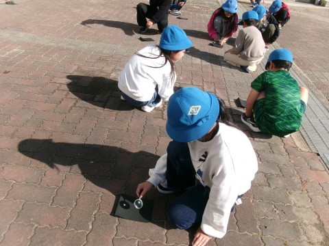 2組は理科の実験をしていました。太陽の光を虫眼鏡で集めるとどうなるのかという,一番びっくりで楽しい実験ですね~