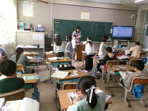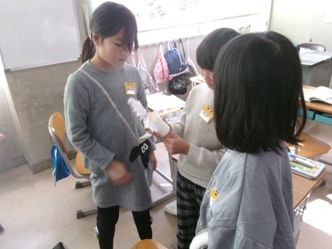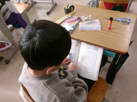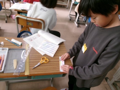 「紙コップ花火」の作り方の説明文の学習です。教科書を読み取りながら,実際に作ってみよう!ということで,様々な形で取り組んでいました。一人で教科書を読み込みながら試行錯誤する子,先生に質問しながら完成させる子,できたものを見せ合って楽しそうに確かめ合う子,素敵な姿でした。