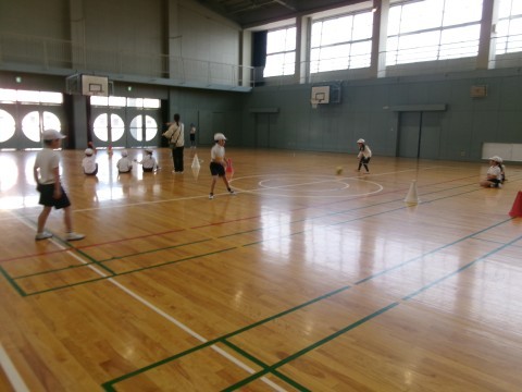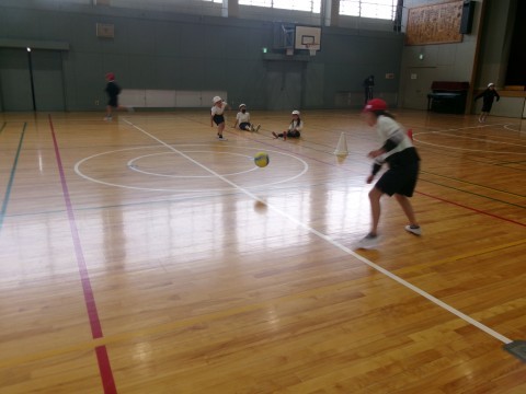 「ころがしバレーボール」です。転がしたボールを腕で打って相手の陣地に返します。なかなか白熱していました!