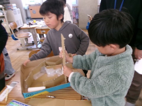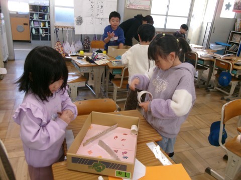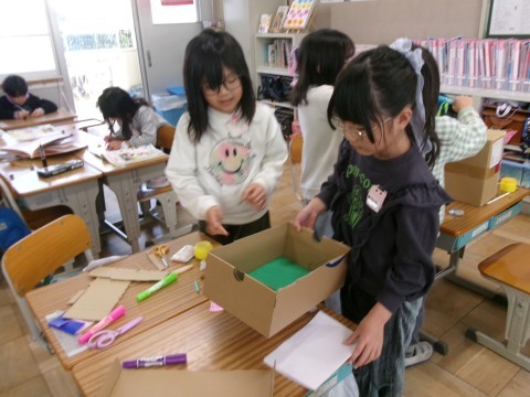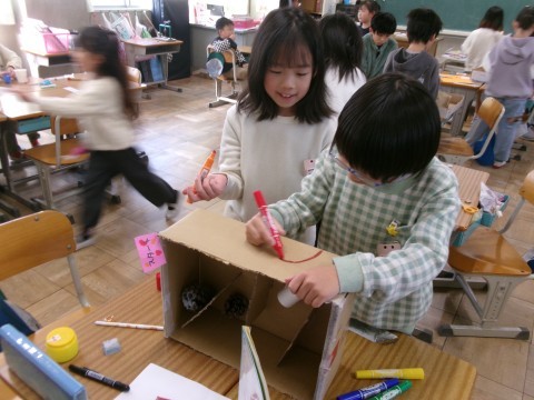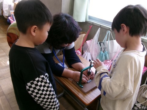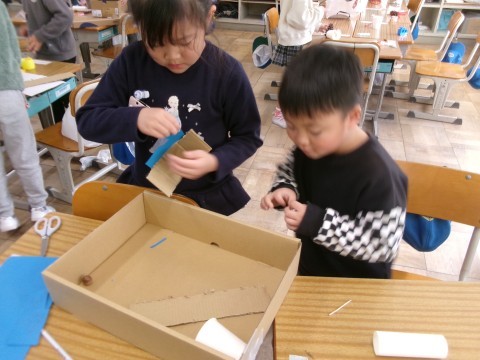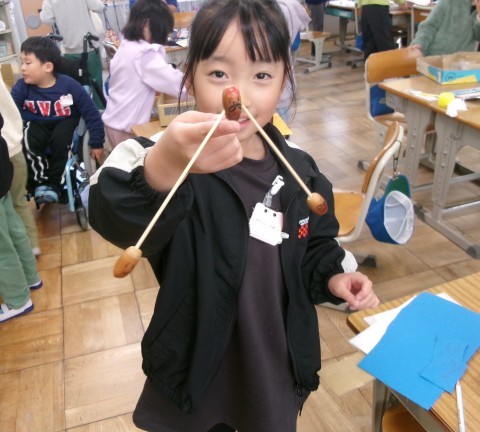 「秋見つけ」で見つけてきたどんぐりや落ち葉を利用して,みんなが楽しめるおもちゃを作っています。ペアやグループで,話し合いながら困ったことは解決していました。アイデアも出し合っていて,とても楽しそうでした。どんぐりに穴を開けるのも自分でチャレンジ!貴重な体験ですね~