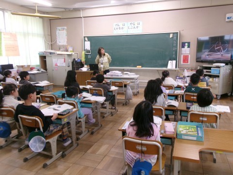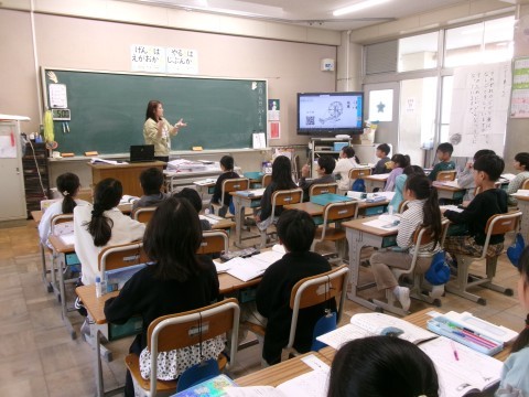 「たぬきの糸車」という教材を使っての学習の1時間目です。そこで,まず,糸車ってどんなもの?と,動画を見ながら確認していました。初めて見るものに子ども達は興味深々でした。