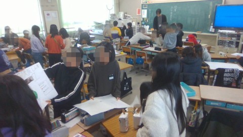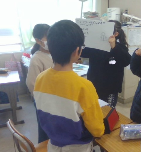 授業の最後に一部のグループがみんなの前で発表し,他のグループの友だちから感想やアドバイスを貰っていました。ここから更に改良を重ねて,本番を迎えるのかな?2年生にバッチリ伝わるといいね!