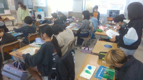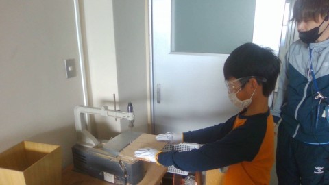 オリジナルのパズルを作成中。絵を描いて色付けし,ニスを塗った人から,初の電動のこぎりに挑戦!