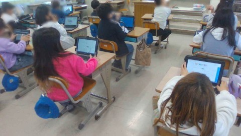 1組では,タブレットを使って学習をしていました。冬休みの宿題でもタブレットでの学習があるようです。その為,学習の仕方を再確認し,みんなで取り組んでいました。間違えた問題も再挑戦して,全部〇になるようにしよう!と先生から話がありました。冬休み中も頑張ってね!