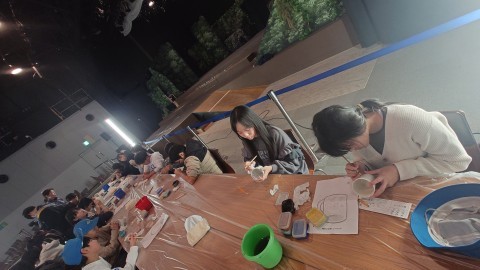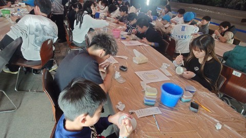 絵付け体験でコップに手を入れています。修学旅行の良い記念になりますように。