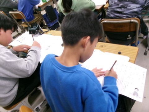 「意見文を書く」という学習です。まずは「ベンチにやねがあるといい」「宿題はなしで学校で勉強すればいい」など,自分の伝えたい意見(主張)を一生懸命考えていました。