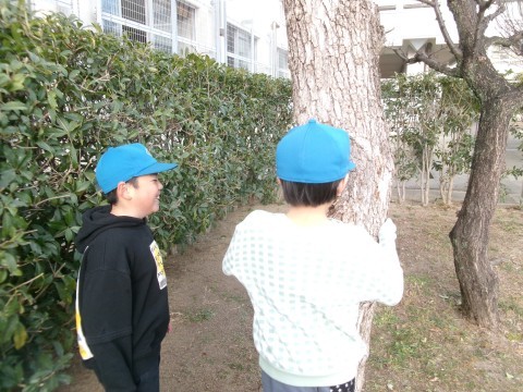 最初は冬の生き物見つけをしていました。木の幹に穴が開いているのを見つけて,のぞき込む子ども達や運動場の隅を丹念に探している姿がありました。