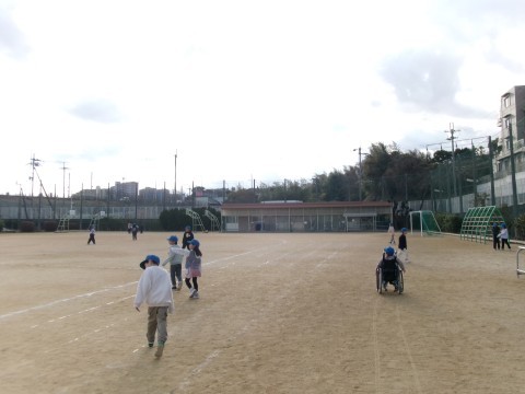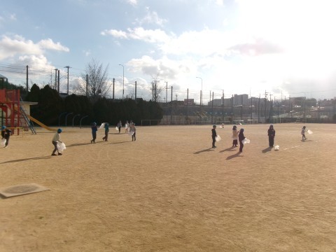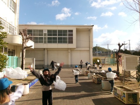 また,その後,袋を使って,楽しそうに風と遊んでいました。校舎の2階くらいまでうまく飛ばせた子もいました。ほかに冬の自然を生かした遊びにつながっていくのが楽しみです。