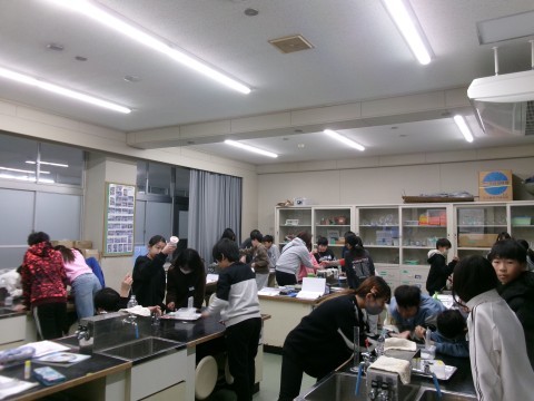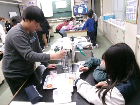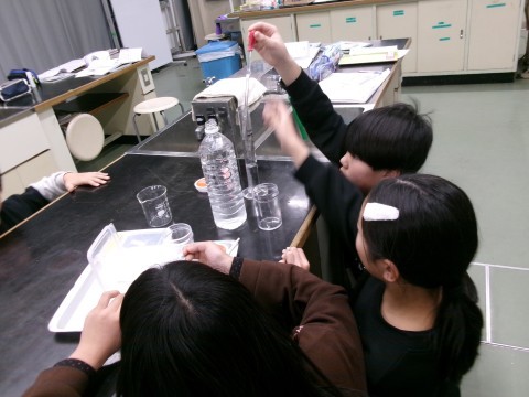 一定量の水に塩とミョウバンをそれぞれ溶かしすと,どのくらいの量を溶かすことができるのかという実験です。予想を立てて,いざ実験!でも,塩を擦切り一杯はかることやメスシリンダーという道具を使って水をはかることがなかなか難しい・・・。頑張っています!