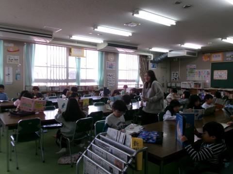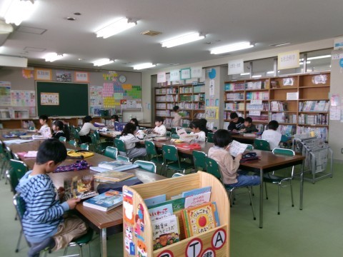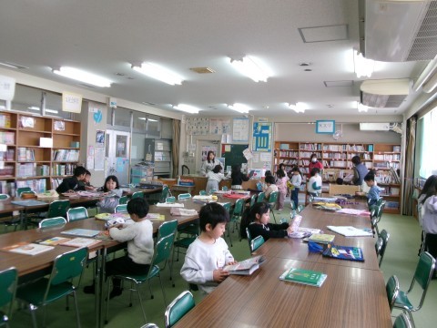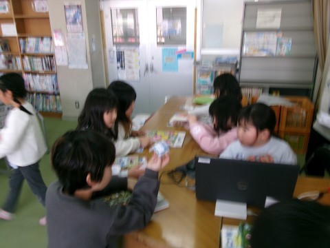 前半は自分の借りた本を返し,借りたい本を探していました。そして後半は回転読書といって,回転ずしのように本を回してあたった本を読んでいました。普段手にしない本との出会いを楽しんで,本の世界を広げるための取り組みです。係りの子もしっかり自分の仕事をしていました!