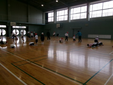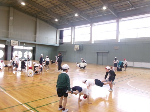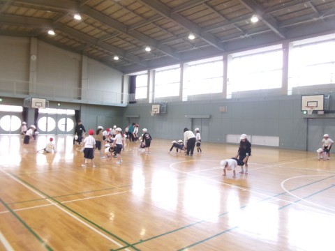 くまやあざらしなど色々な動物になりきって,体づくりの運動をした後に,自分の体をしっかり支えたり,ダイナミックに使ったりする運動に取り組んでいました。