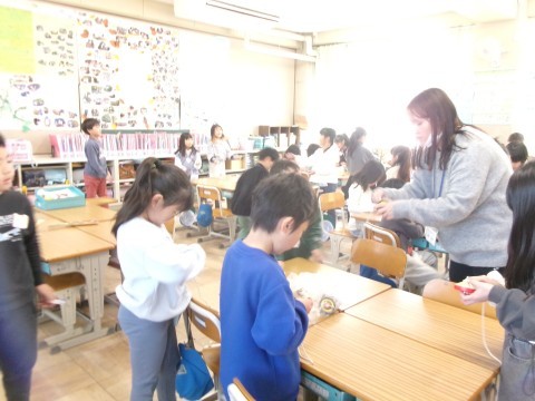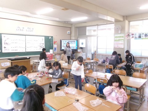 昔の遊びを体験していました。こまに紐を巻くのに苦戦中。けん玉以外と難しいな~。羽子板なかなかあたらないなあ~。でも時間とともに「あ,できた!」が増えて楽しそうでした!